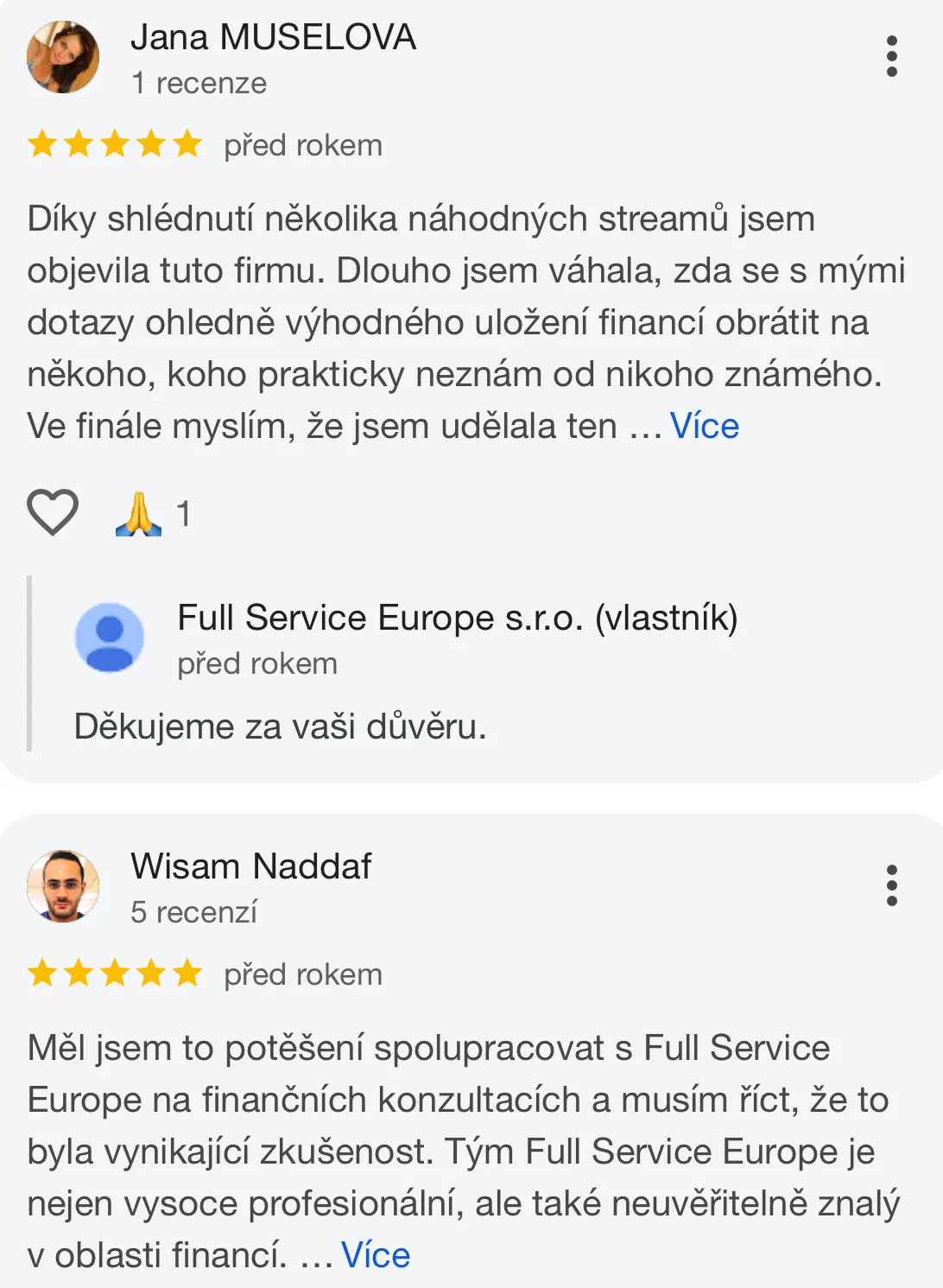 Firmu, konkrétně Petra Chmurčiaka, jsem oslovila po náhodném zhlédnutí streamu. Petr dokáže profesionálně poradit, zodpověděl mi na případné nejasnosti a investice pomůže rozložit do více produktů. To že jsem Petra oslovila považuji za svoji skvělou investici, která se zúročí v následně vybraných produktech;). Velmi kladně také hodnotím jeho dochvilnost při domluvených schůzkách. Děkuji a firmu budu velmi ráda doporučovat.